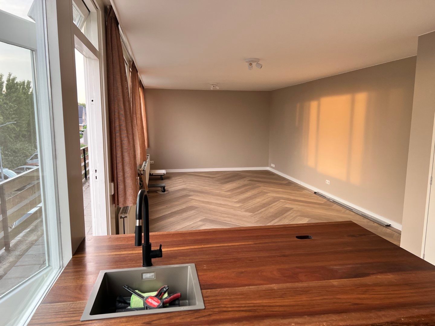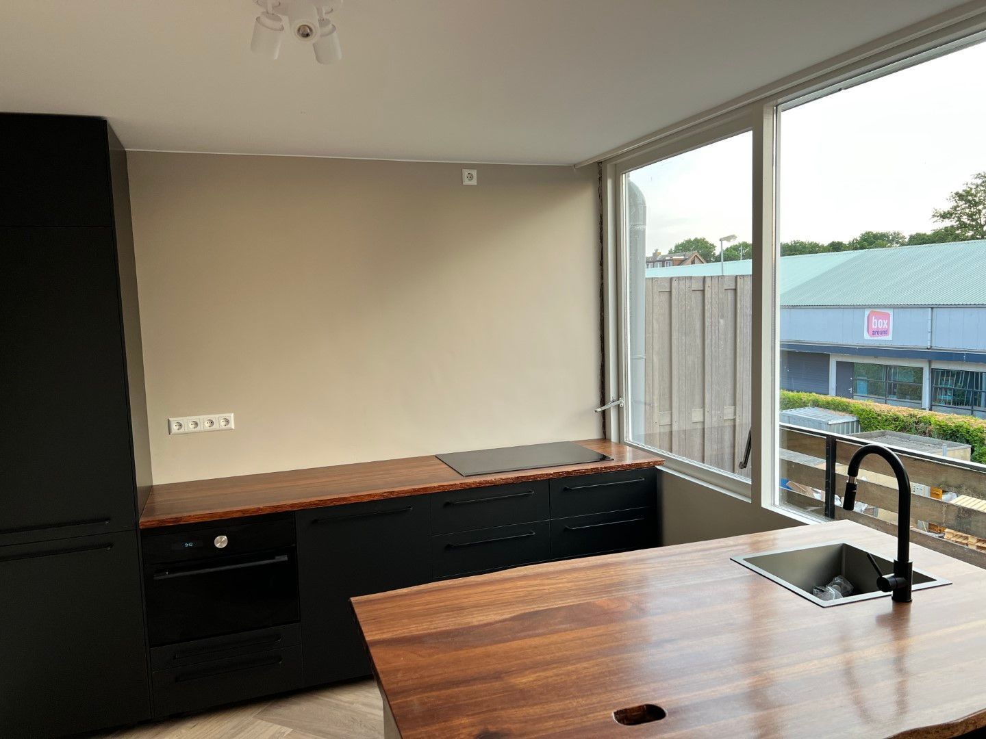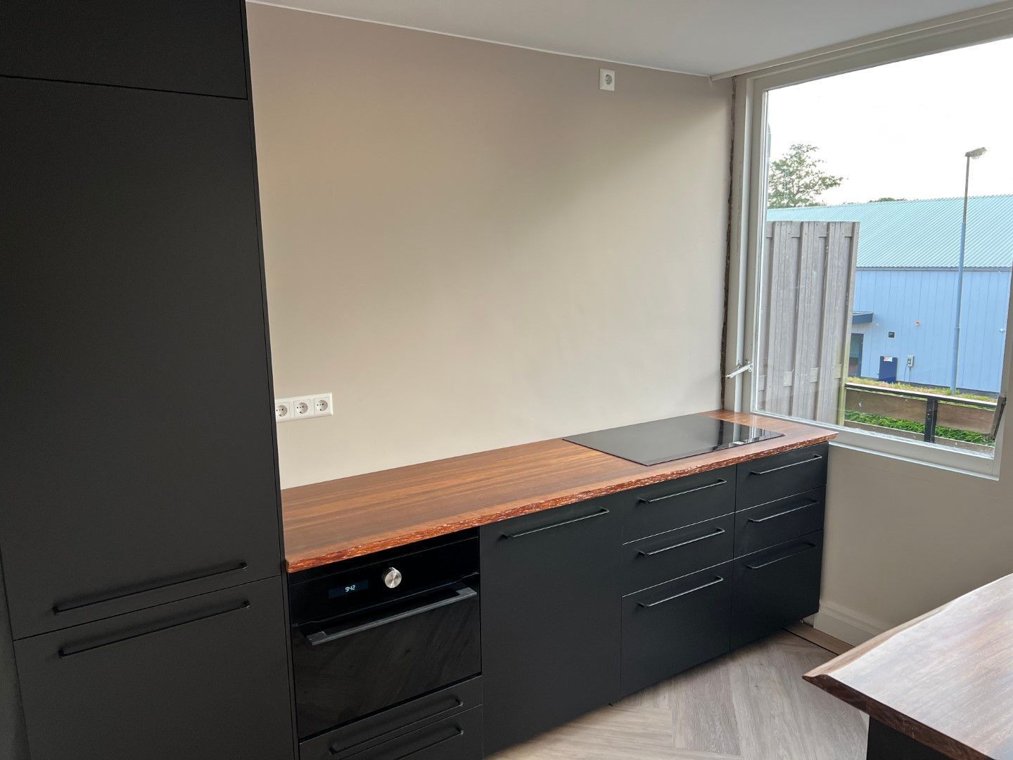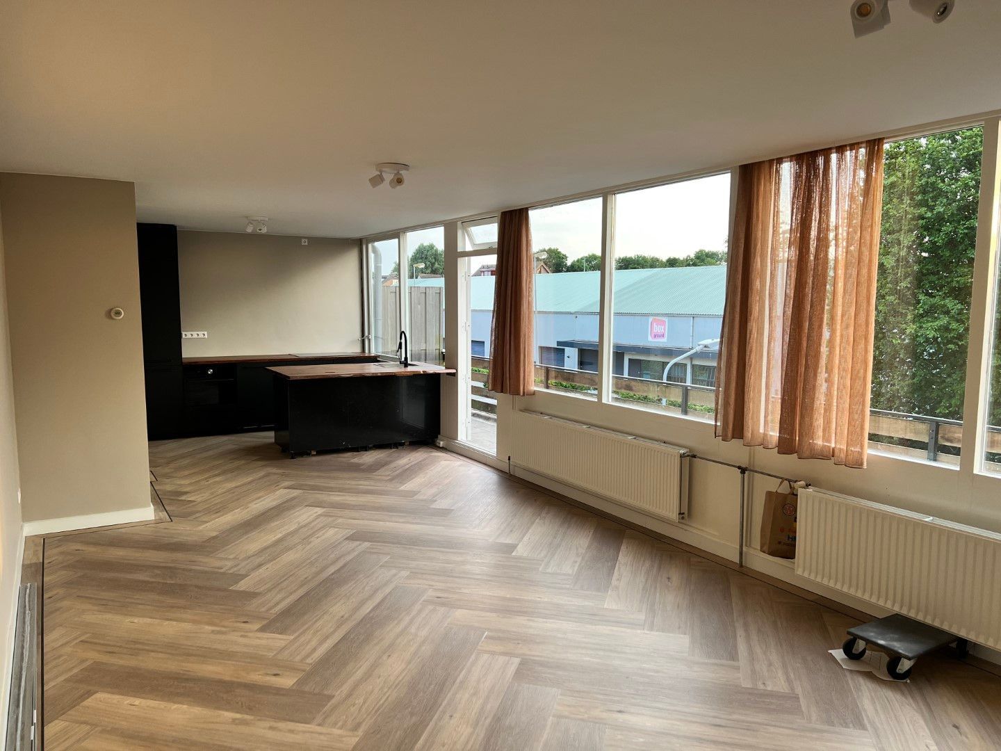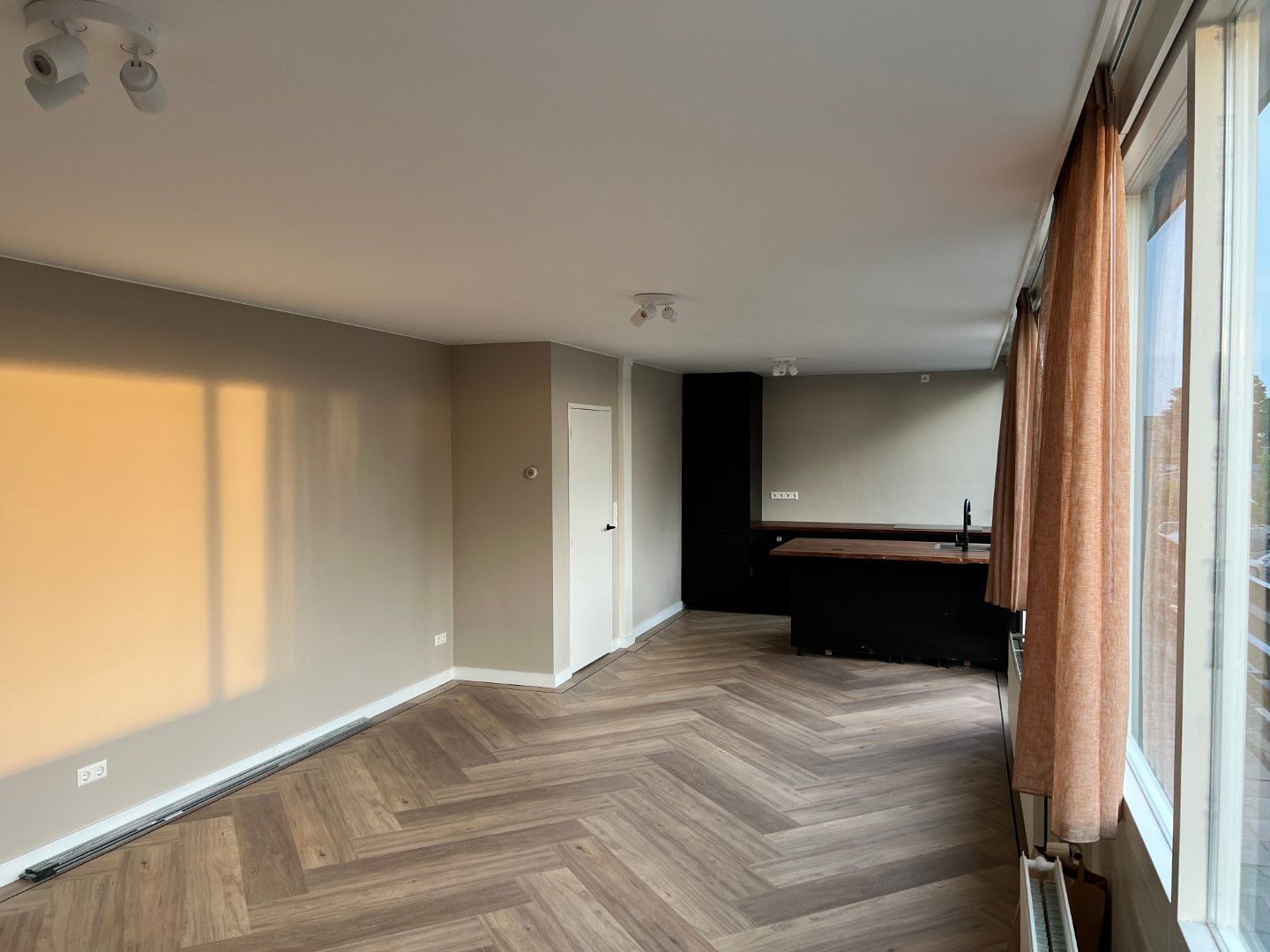 Woonkamer met een recente geïnstalleerde, complete keuken inclusief inbouwapparatuur. Deze woning is beschikbaar voor werken met een aantoonbaar inkomen.